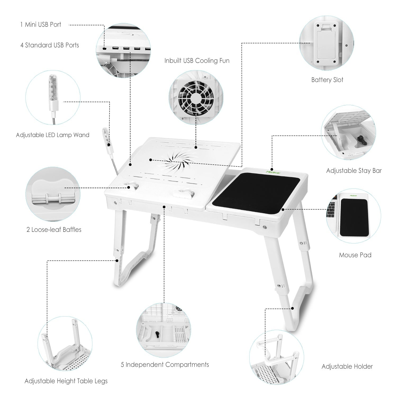 *Upgraded Versatile Laptop Table:Comes with a large mouse pad,a inbuilt perforated cooling fan,a LED lamp with adjustable light wand,4 x USB 2.0 ports and some inbuilt storage compartments with 4 cm depth. It can effectively protect your laptop and bring you much convenient.